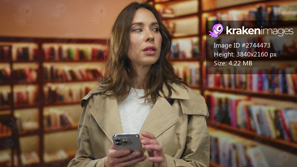 Woman in library using smartphone indoors surrounded by shelves focused deeply portraying modern tech lifestyle.