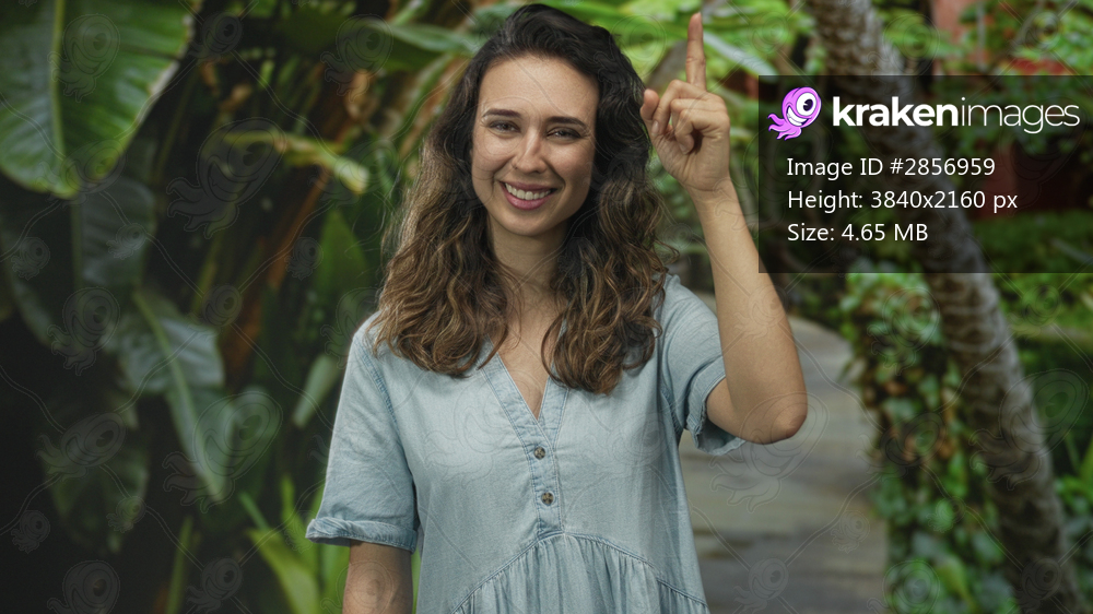 Woman in light blue dress pointing finger upward in lush green forest walkway under tropical foliage; optimism.
