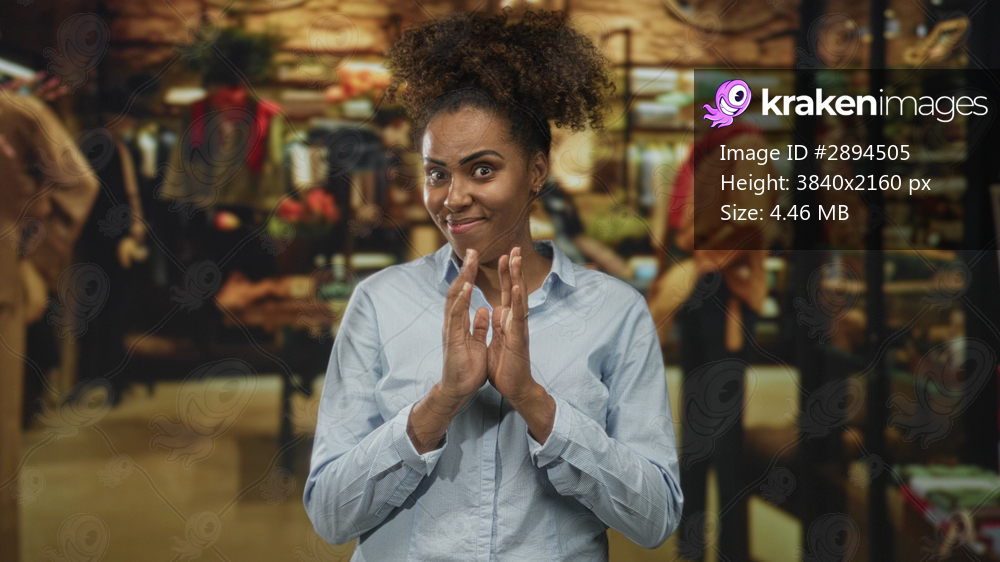 Woman in light blue shirt clasping hands inside retail building while smiling with closed eyes and nodding slightly; quiet contentment shopping moment. - Kraken Images