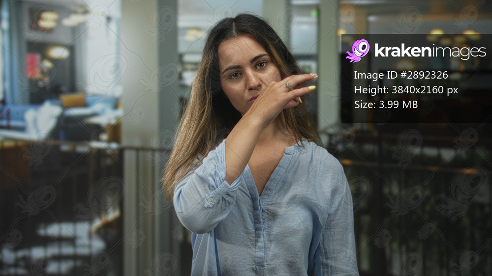 Woman in light blue shirt with hand raised toward face, hair loose and visible collarbone, standing in hotel building interior; introspection calm.