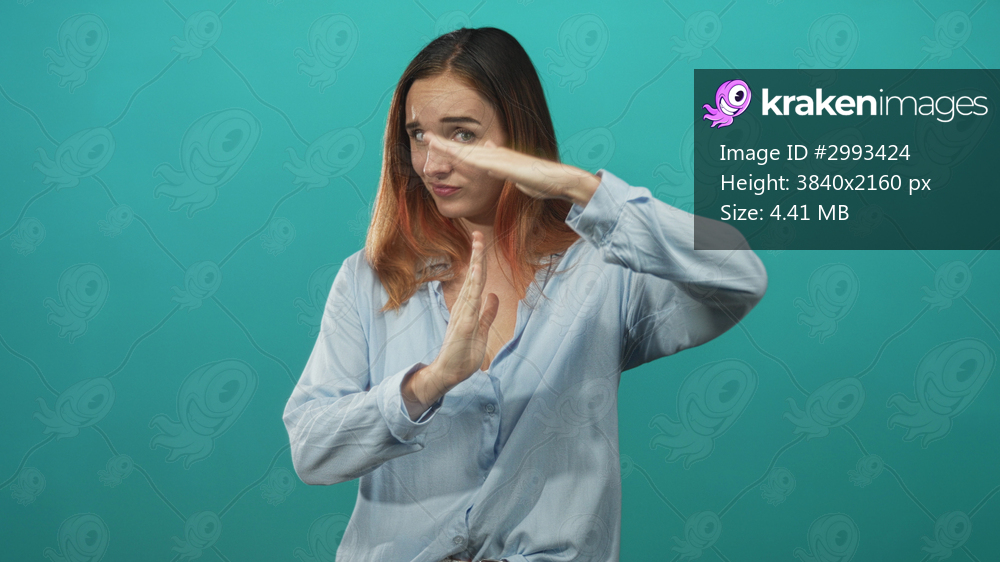 Woman in light blue shirt makes time out gesture with hands in studio teal backdrop, palm horizontal above vertical hand signaling stop; refusal.