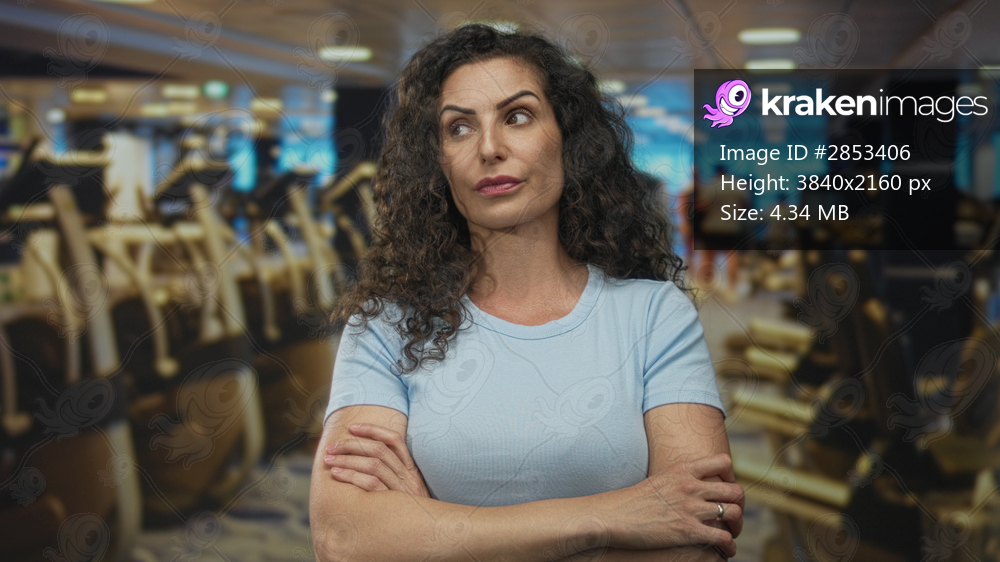 Woman in light blue shirt standing with crossed arms and bare hands in gym building interior; focus strength resilience confidence.
