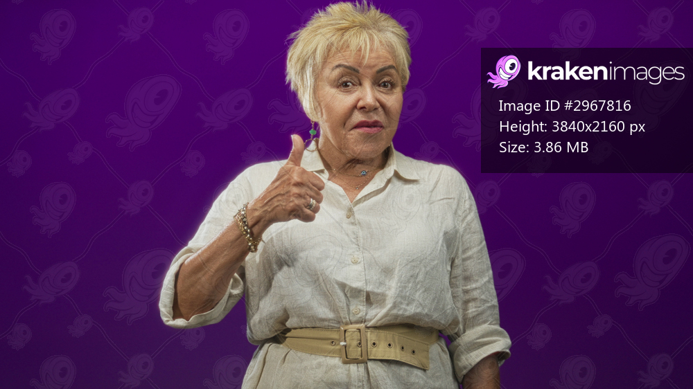 Woman in linen shirt points finger to chest and gives thumbs up while smiling in purple studio setting; confidence joy.