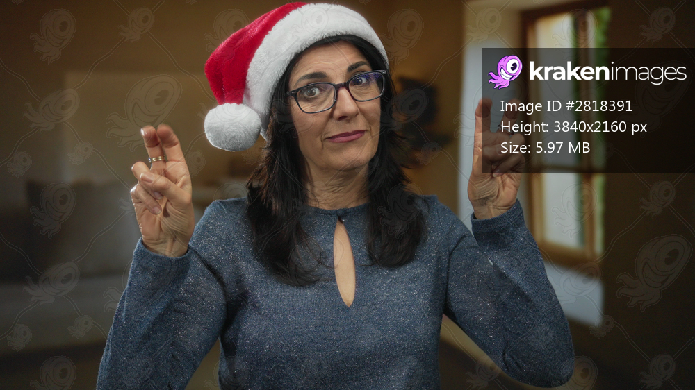 Woman in living room wearing santa hat makes air quotes gesture while looking amused with playful smile; holiday cheer.