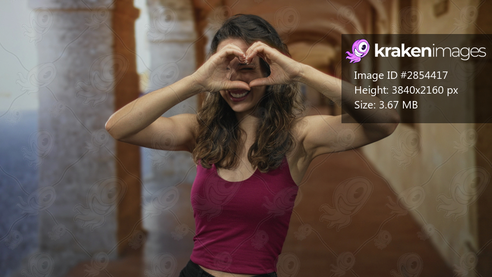 Woman in magenta tank top makes heart shape with fingers with both hands in old town building; love joy.