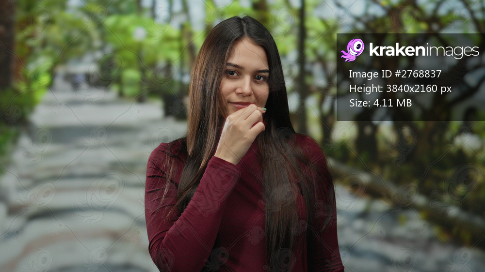 Woman in maroon shirt gestures in a sunny park, conveying a silent action or message, surrounded by vibrant green foliage and dappled sunlight, hinting at a peaceful outdoor setting. - Kraken Images