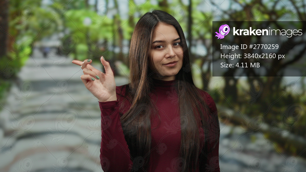 Woman in maroon shirt gestures in a sunny park, conveying a silent action or message, surrounded by vibrant green foliage and dappled sunlight, hinting at a peaceful outdoor setting. - Kraken Images