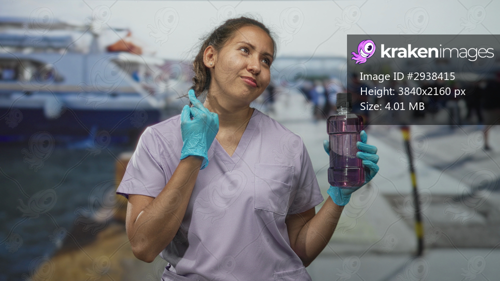 Woman in medical scrubs with gloved hand on cheek indicating toothache holding a mouthwash bottle on a busy street pier; uncertainty.