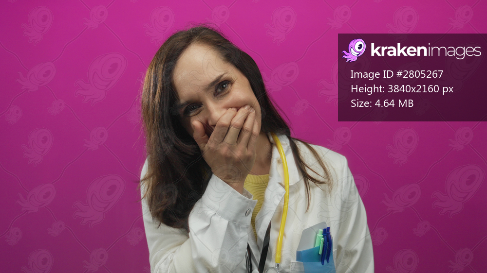 Woman in medical uniform, with stethoscope, laughing over isolated pink background, representing joy in healthcare profession.