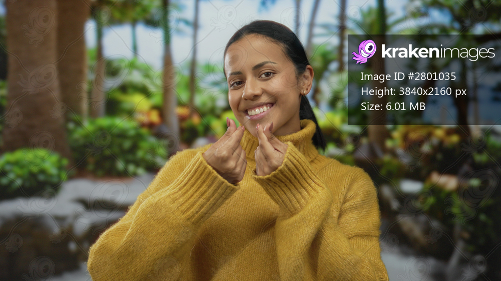 Woman in mustard sweater making heart gesture with fingers smiles warmly in lush green park with palm trees and vivid plants enhancing the outdoor setting - Kraken Images