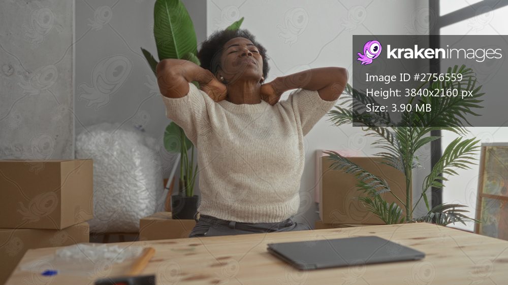 Woman in new apartment closes laptop looking exhausted surrounded by unpacked boxes, sitting at a wooden table, embodying blend of fatigue and settling into cozy environment. - Kraken Images