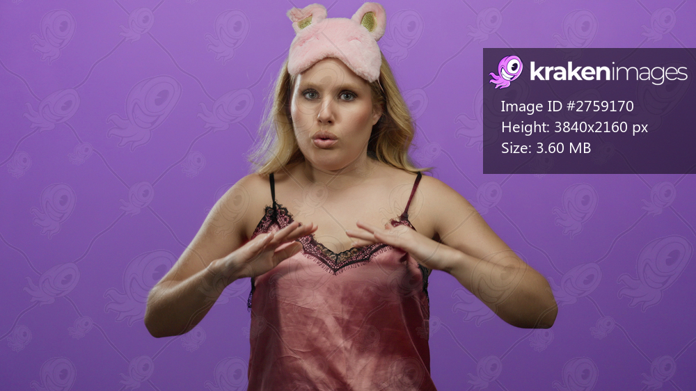 Woman in nightwear with blonde hair calms herself in front of a purple background wearing a pink sleep mask and breathing deeply.