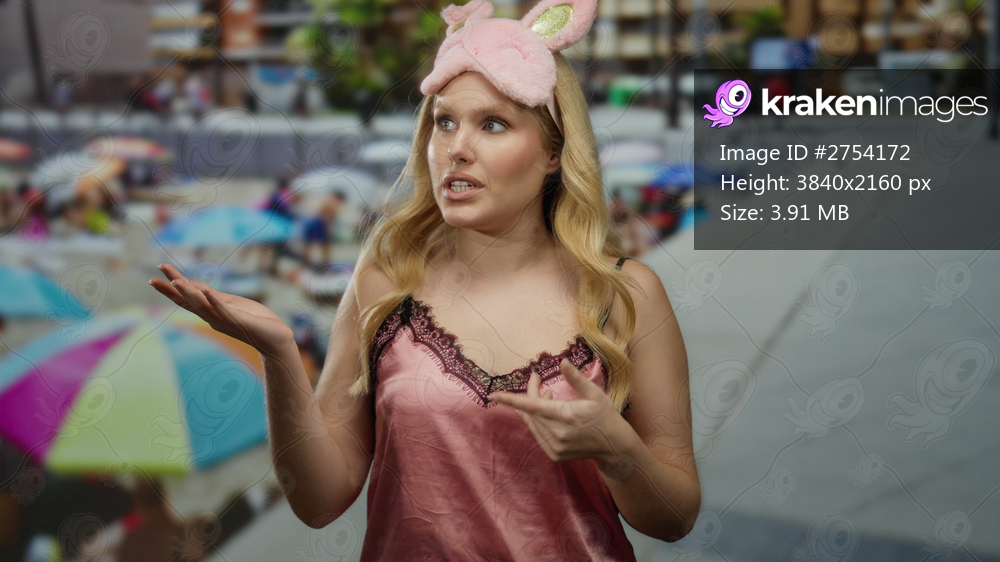 Woman in nightwear with bunny ears talking near a colorful beach backdrop, highlighting casual and youthful summer vibes.