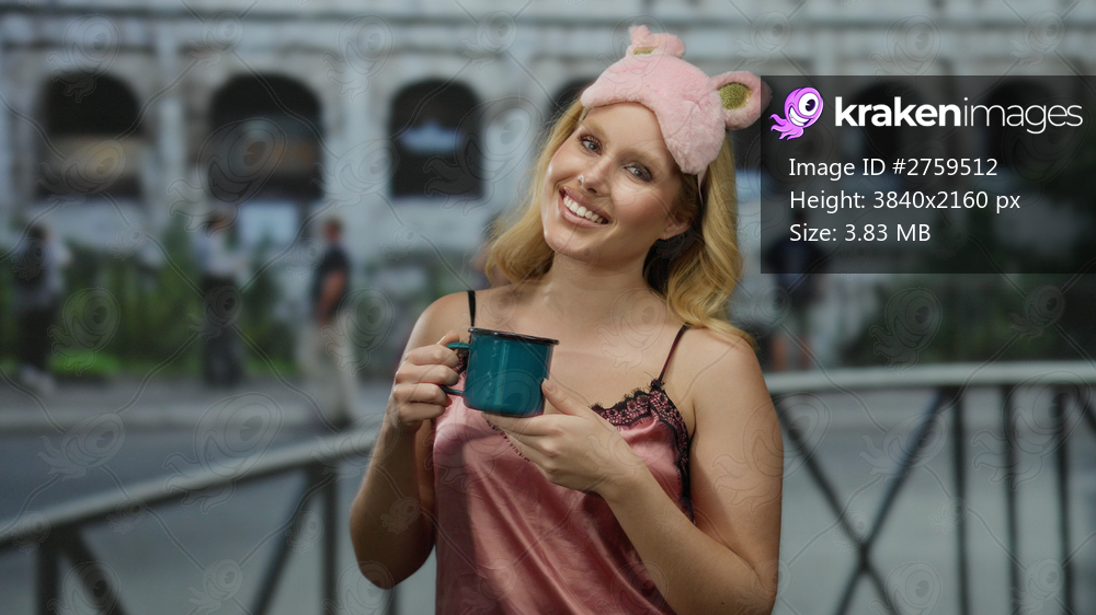 Woman in nightwear holding a mug near coliseum backdrop in rome, smiling playfully, embodying relaxed morning vibes with iconic italian architecture in the background. - Kraken Images