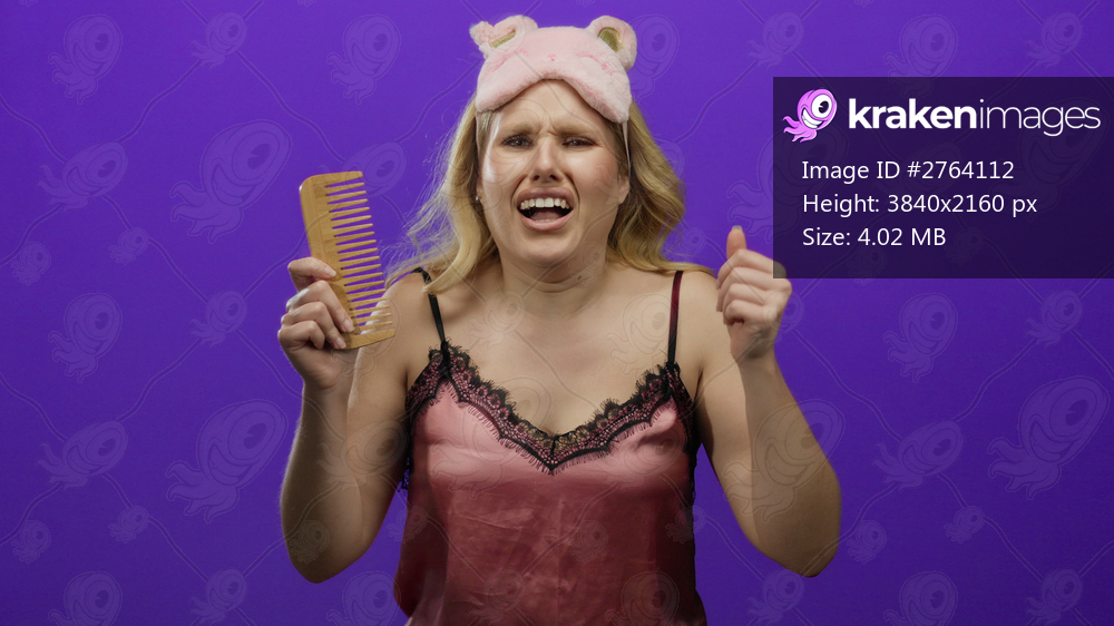 Woman in nightwear holding brush with confused expression against purple background wearing sleep mask