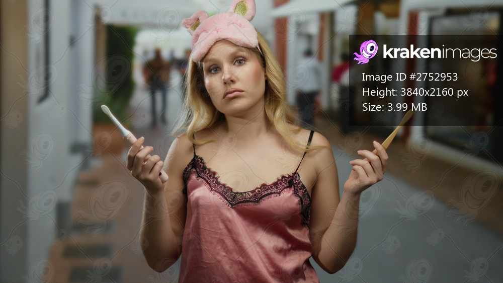 Woman in nightwear with toothbrushes on a city street at night, wearing a bunny sleep mask, reflecting a night routine outdoors.