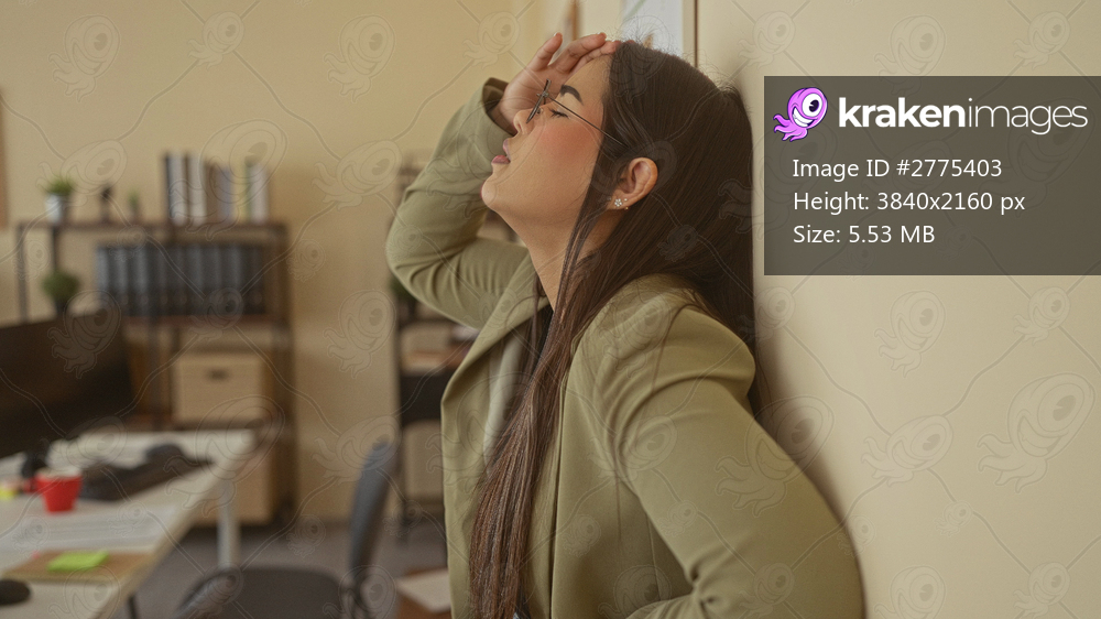 Woman in office feeling stressed with hand on forehead, wearing glasses and blazer, standing near wall, surrounded by furniture and files in a workplace setting. - Kraken Images