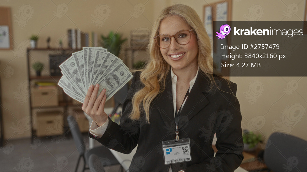 Woman in office holding dollar bills with a confident smile, wearing glasses and business attire, representing financial success and stability in a professional indoor environment. - Kraken Images