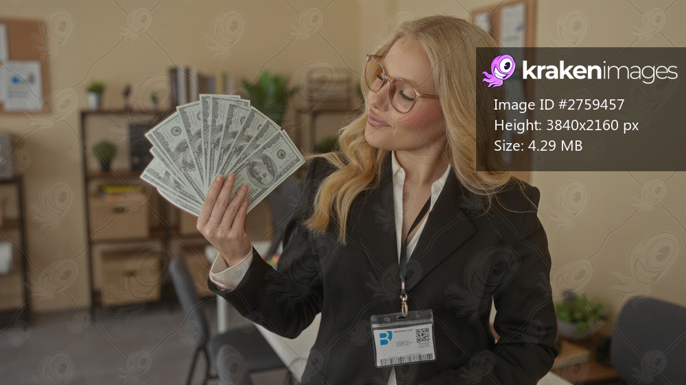 Woman in office holding dollar bills with a confident smile, wearing glasses and business attire, representing financial success and stability in a professional indoor environment. - Kraken Images