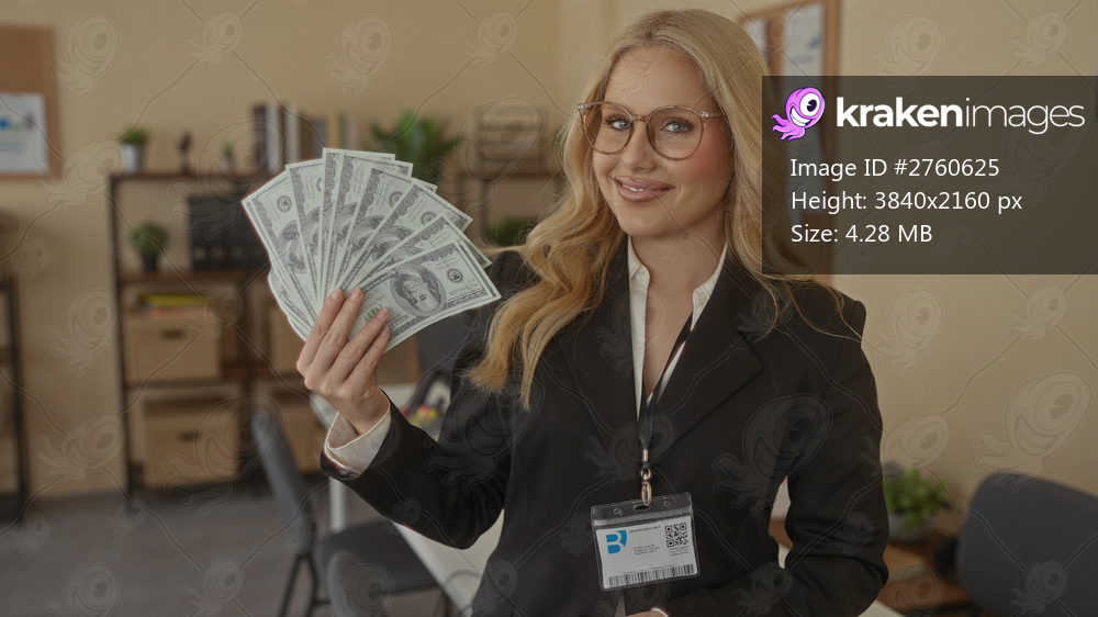 Woman in office holding dollar bills with a confident smile, wearing glasses and business attire, representing financial success and stability in a professional indoor environment. - Kraken Images