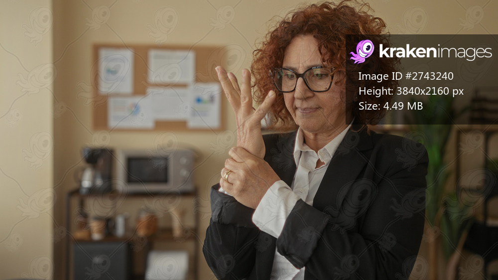 Woman in office holding wrist wearing glasses and suit in indoor workplace with brunette hair and serious expression.