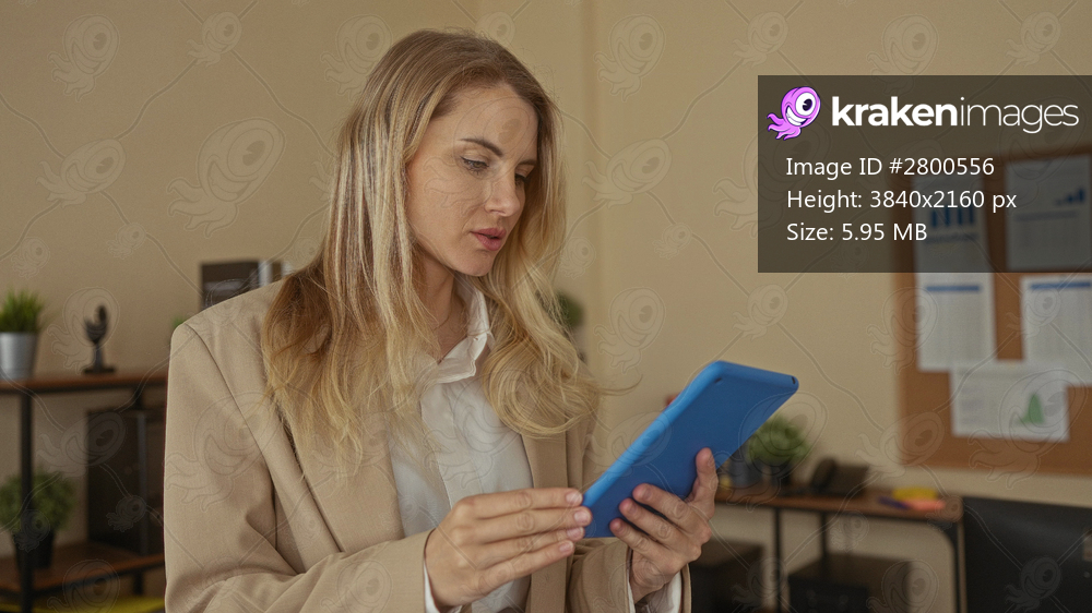 Woman in office looking at tablet with concerned expression, blonde hair, wearing suit, surrounded by plants and shelves, workplace setting, interior design, analytics charts visible.