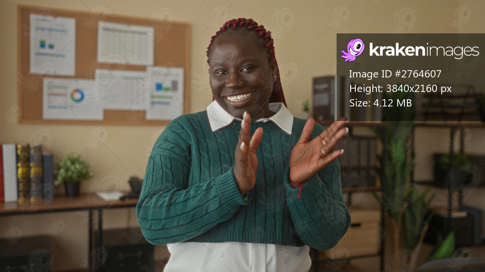 Woman in office smiling and clapping in green sweater with charted bulletin board in background suggesting positive work environment with african american presence. - Kraken Images