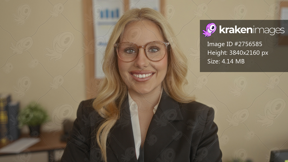 Woman in office smiling confidently wearing glasses and suit with blonde hair, books and plant in background, creating a modern and professional atmosphere. - Kraken Images