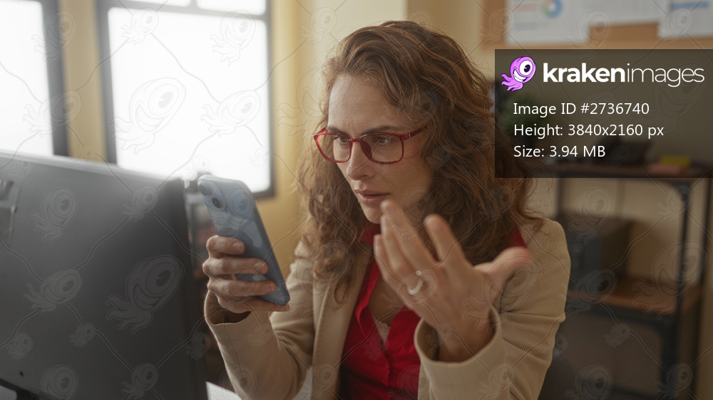 Woman in office using smartphone with confused expression, wearing red glasses, seated at a desk with a modern interior, suggesting business communication or technology use. - Kraken Images