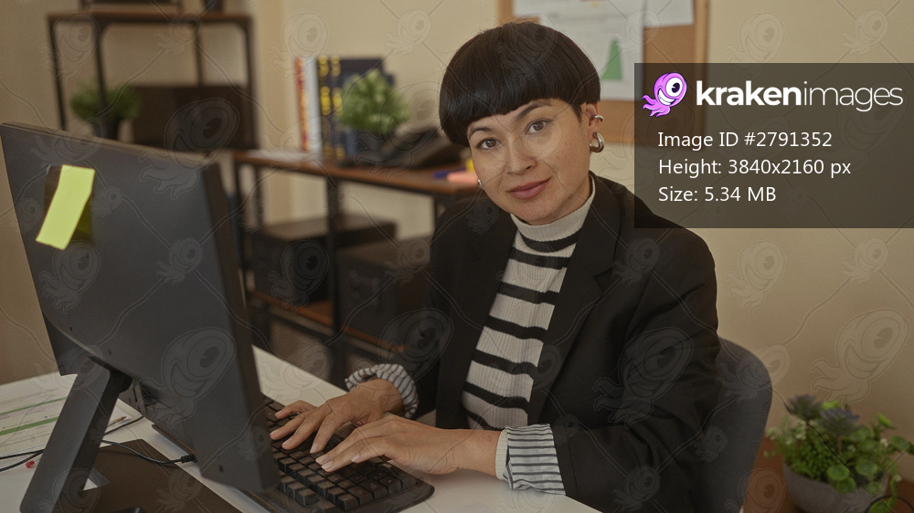 Woman in office working on computer, wearing striped sweater and blazer, with potted plants and books on shelves, focused, professional atmosphere highlighting a modern workplace. - Kraken Images