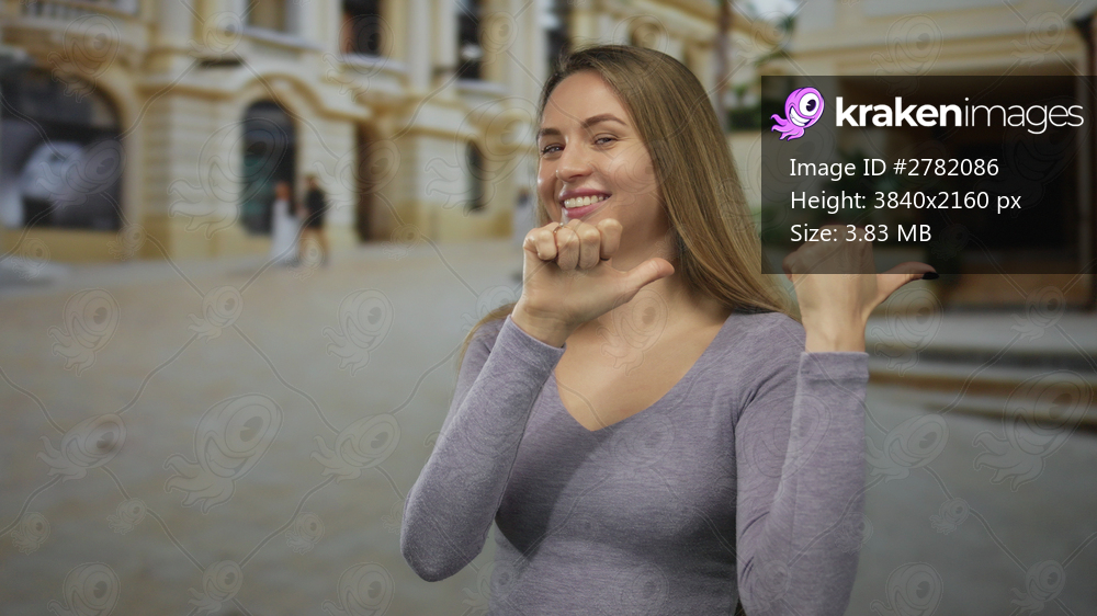Woman in old town street smiling with hands gesturing thumbs in opposite directions wearing casual gray outfit happy in outdoor city setting.