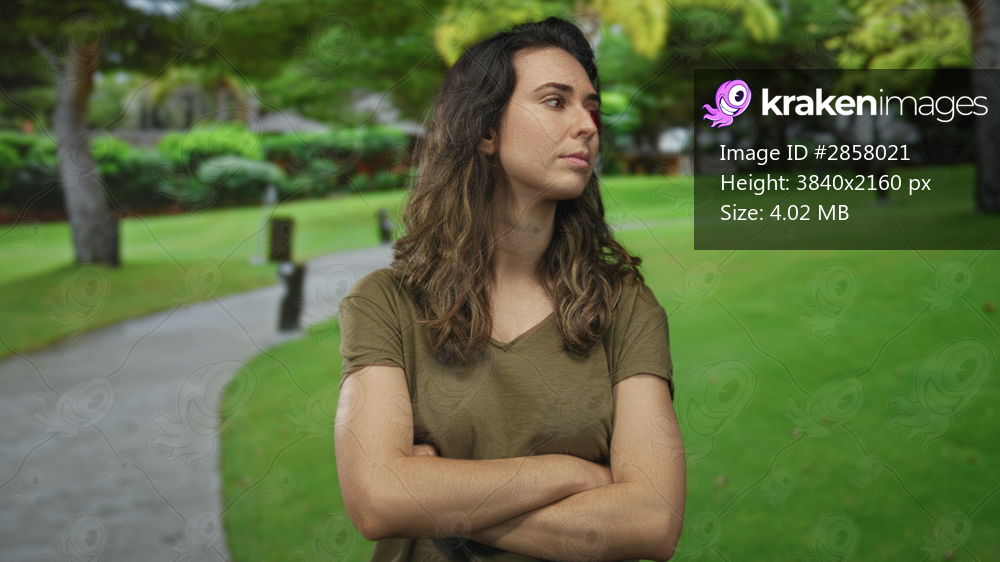 Woman in olive shirt crosses arms and looks sideways in a green park with a paved path under shaded trees; rejection.