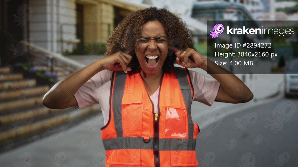 Woman in orange high visibility vest plugs fingers into ears and screams on a city street near steps and parked car; frustration safety.