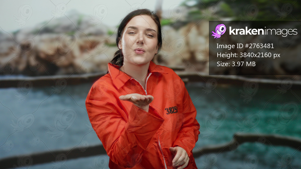 Woman in orange jumpsuit blows kiss and forms heart with hands against scenic beach and sea backdrop, expressing emotion and freedom.