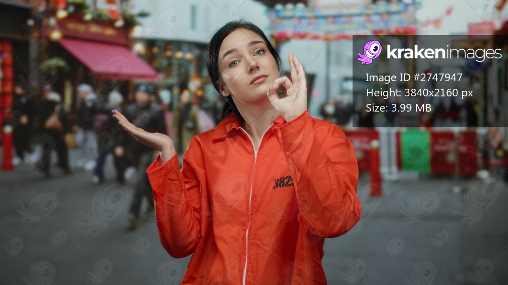 Woman in orange jumpsuit gestures on busy street with an ok sign, showcasing playful confidence amidst the vibrant outdoor city scene.