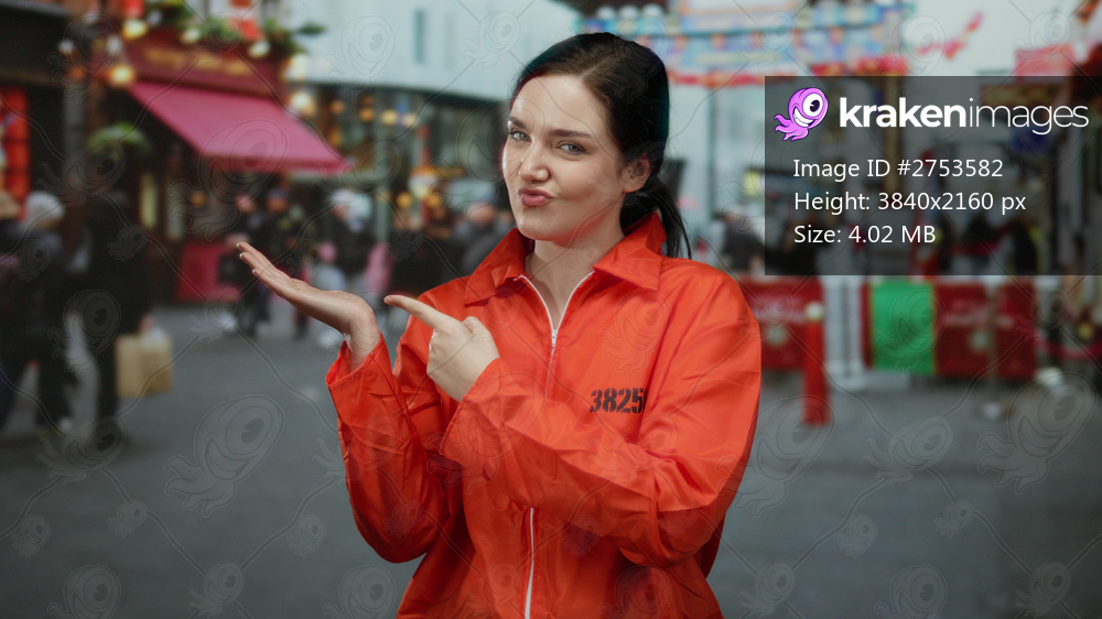 Woman in orange jumpsuit gestures on busy street with an ok sign, showcasing playful confidence amidst the vibrant outdoor city scene.