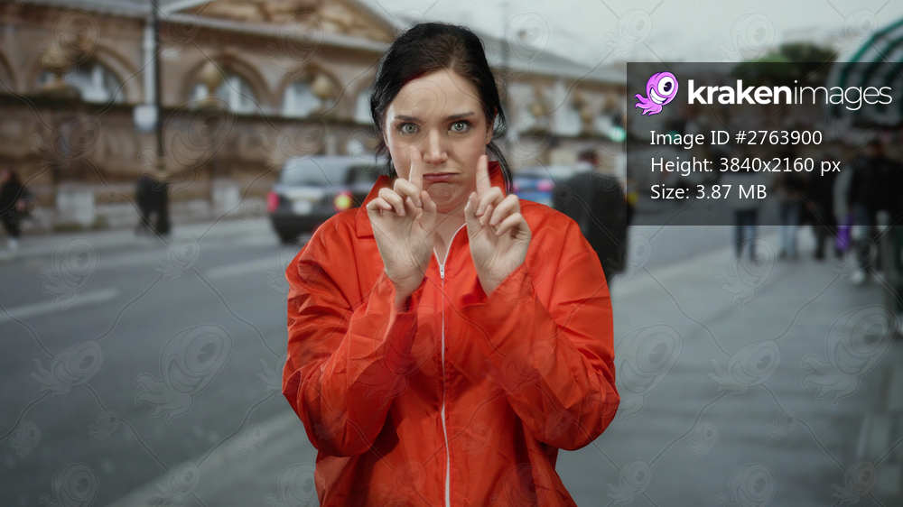 Woman in orange jumpsuit stands outdoors on busy street, looking nervous with hands clasped, surrounded by cars and people passing by in the background. - Kraken Images
