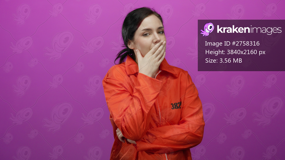 Woman in orange prison jumpsuit with brunette hair looks concerned against a vibrant pink background, conveying a sense of vulnerability and emotion.