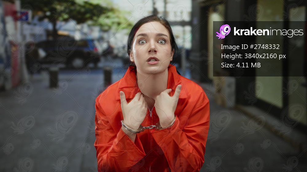 Woman in orange prison jumpsuit with handcuffs outside on a busy street looking distressed with blurred background in daytime.