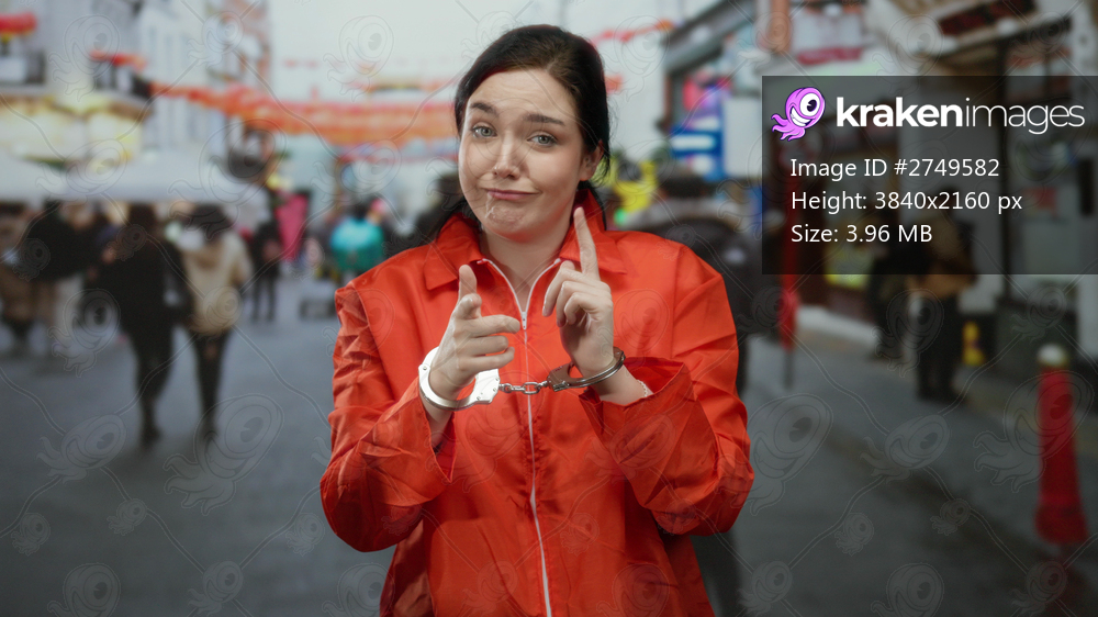 Woman in orange prison jumpsuit with handcuffs poses outdoors on a busy street, blending humor and irony in an unexpected urban setting.