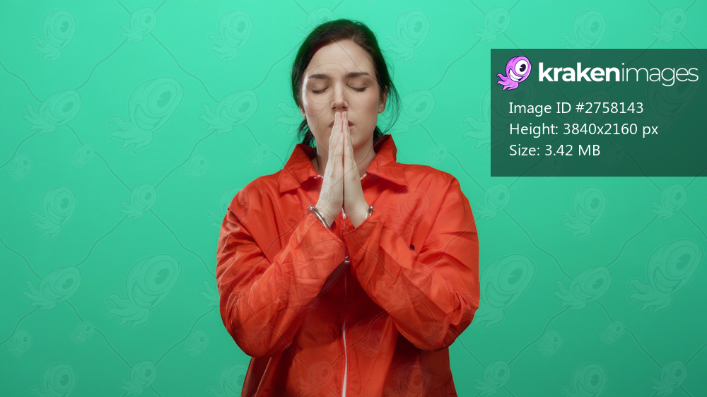 Woman in orange prison jumpsuit with handcuffs praying against green background captured in calm contemplative stance showing justice and serenity.