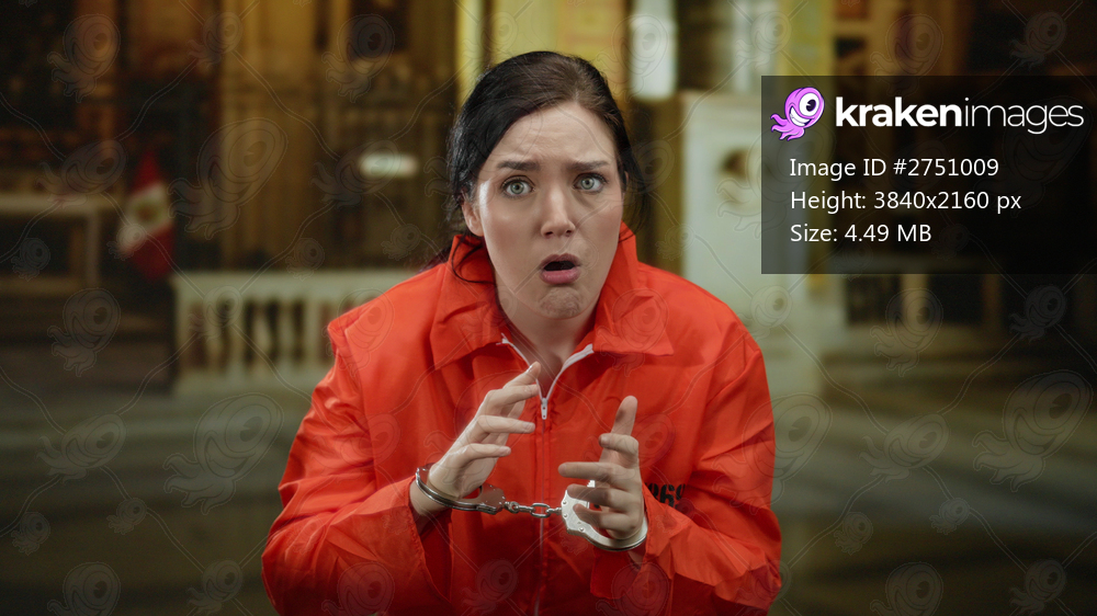 Woman in orange prison jumpsuit with handcuffs stands in a catholic church, expressing emotion against a backdrop of peruvian flag, blending themes of incarceration and faith. - Kraken Images