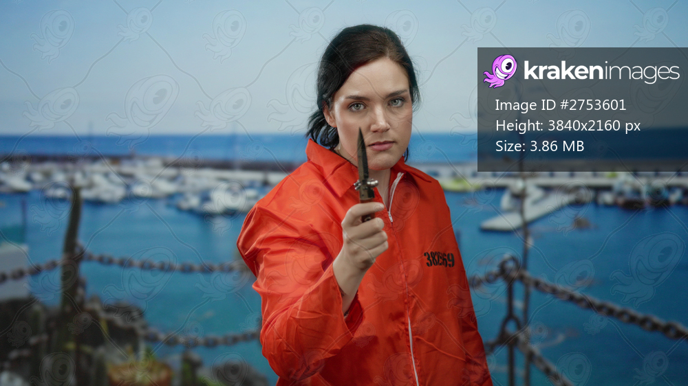 Woman in orange prison jumpsuit holding knife at port with boats in background, exhibiting tense expression.