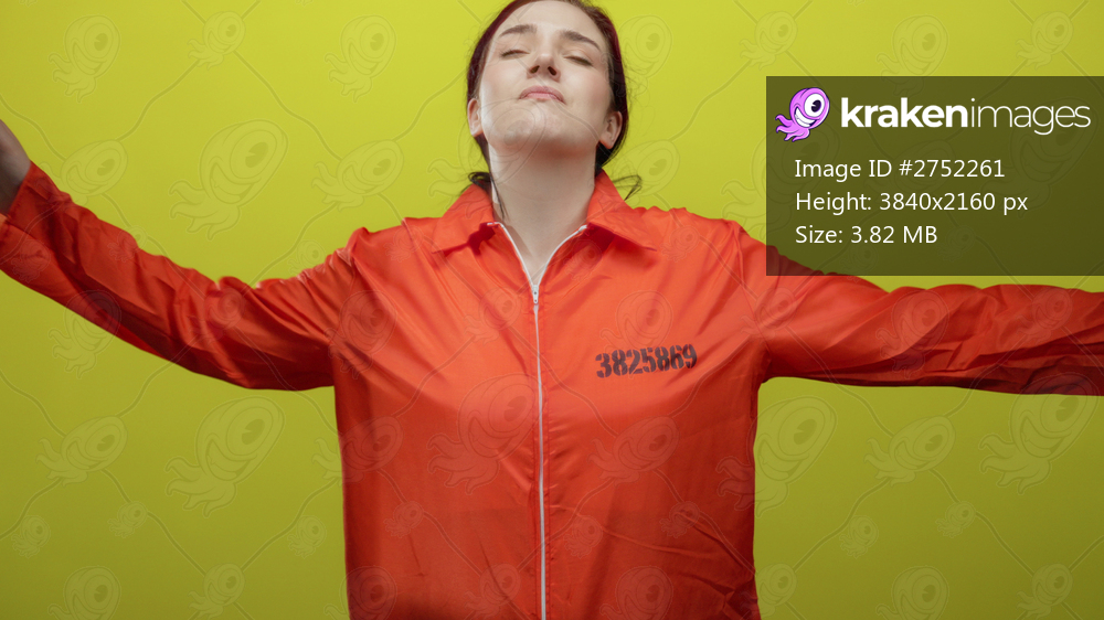 Woman in orange prison jumpsuit stands confidently against a vivid yellow background, eyes closed, symbolizing resilience and inner strength in adversity. - Kraken Images
