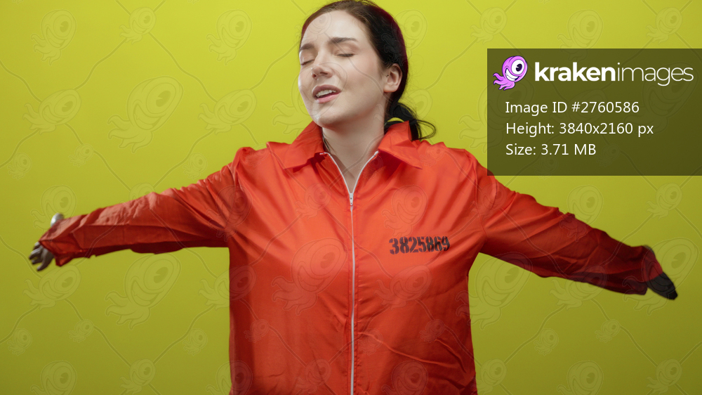 Woman in orange prison jumpsuit stands confidently against a vivid yellow background, eyes closed, symbolizing resilience and inner strength in adversity. - Kraken Images