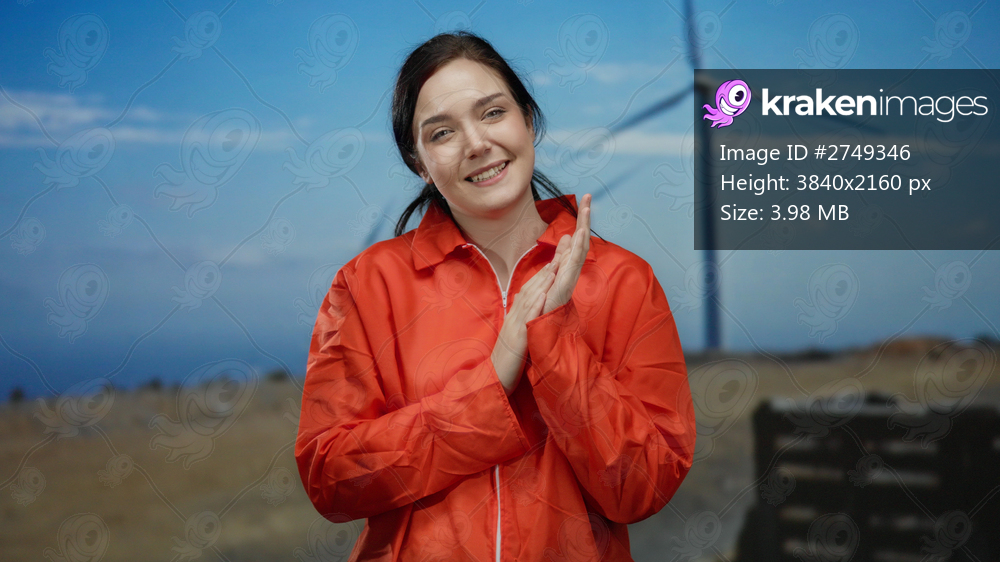 Woman in orange prison jumpsuit stands smiling before wind turbine in open field, brunette hair contrasting against the blue sky, capturing a sense of unexpected freedom. - Kraken Images