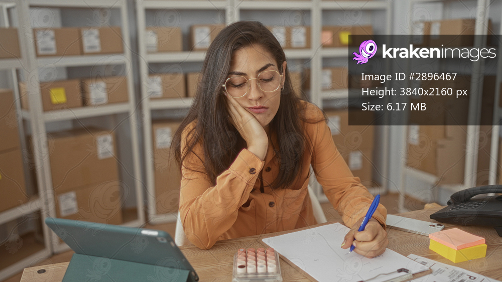Woman in orange shirt tapping pill organizer and hand on cheek at parcel office building; small business stress.