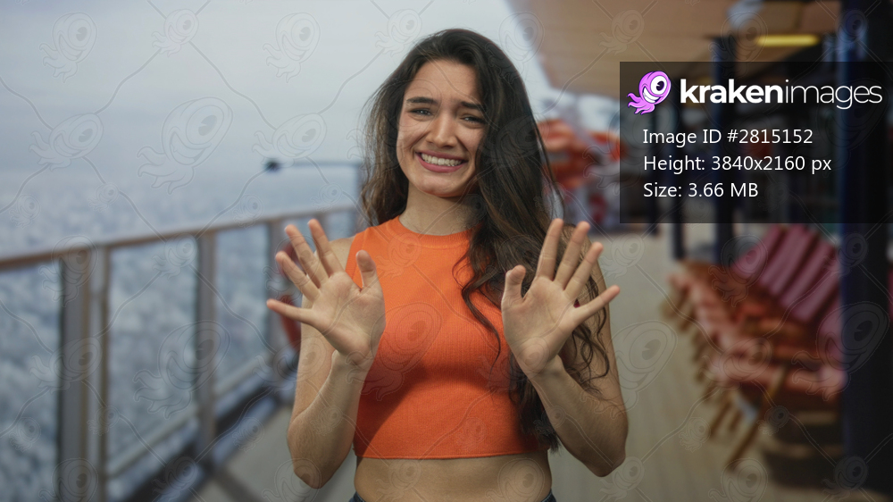 Woman in orange tanktop grimaces with raised hands and clenched fingers while tilting head on street deck under sunlight; disgust.