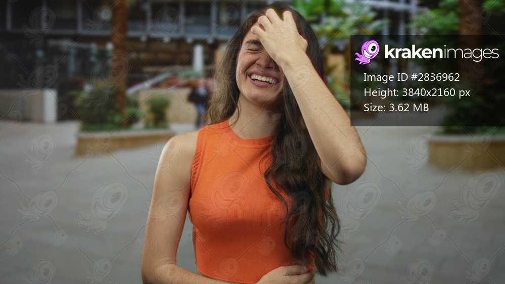 Woman in orange top laughing with hand in hair on street by building facade amid palm trees; carefree joy.