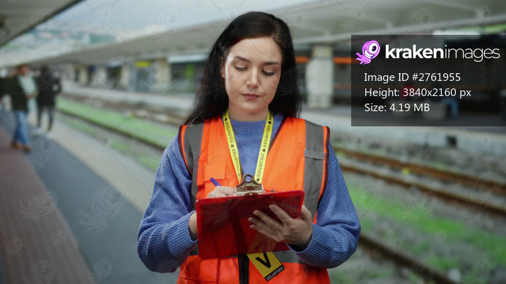 Woman in orange vest at train station outdoors writing on clipboard, showcasing volunteer work with brunette beauty in bustling railway environment.